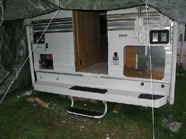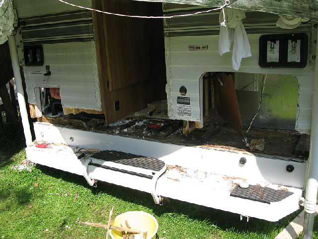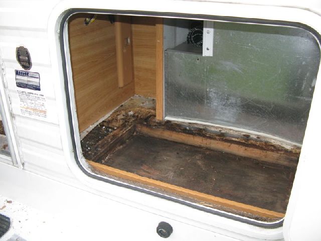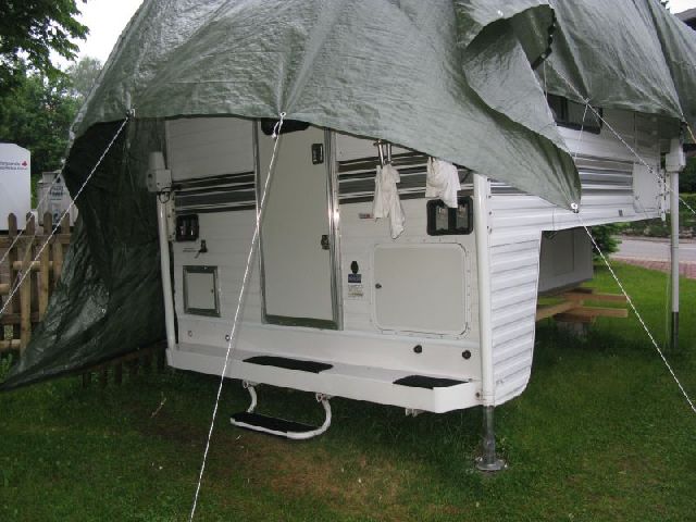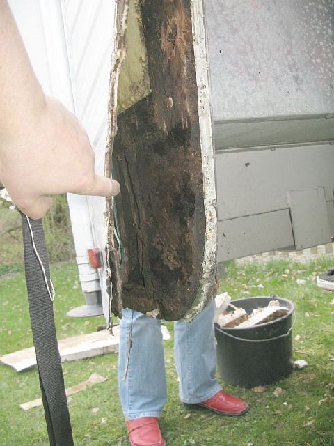 Im sehr hilfreichen Truckcamper-Forum von www.trailerlife.com hatte ich ausserdem zwischenzeitlich (das heisst: zu spät) gelesen, dass die seitlichen Schürzen (Side Skirts) gerne kompostieren (http://www.rv.net/forum/Index.cfm/fuseaction/thread/tid/20593577.cfm). Weil sie nämlich aus verrottungsfreundlichem Weichholz in Verbindung mit leicht vermulchbarem OSB hergestellt sind. Der geniale Konstrukteur hat den Aufbau derart optimiert, dass viele, lange, empfindliche Nähte und Sicken das Wasser hineinlassen können, aber nicht wieder heraus. Kurzum: Die seitlichen Flügelchen waren ebenfalls kompostiert. Weg. Nicht mehr da hinter ihrer Aluminiumverkleidung. Speisereste eines Festessens für Pilze.