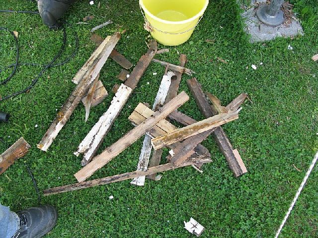 Für den Neuaufbau wollten wir verrottungsresistenteres Holz besorgen. Auch wenn die Kabine nachher natürlich dicht sein wird. Schaden kann es ja nicht, wenn man für alle Fälle vorsorgt. Eine Überraschung erlebten wir dann allerdings beim Holzfachhandel: Es gab nur Nadelholz oder Tropenholz (Bangkirai), und Letzteres nur in Abmessungen für Terrassendielen. Nun gut, Bangkirai ist schwer und teuer aber dafür wenigstens sehr verrottungfest. Und den hinteren Querbalken möchte ich bitteschön nie wieder wechseln müssen.