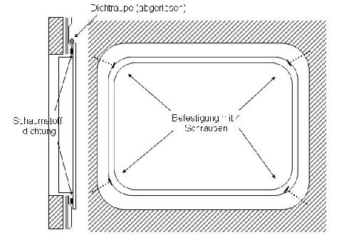 Befestigt ist der Rahmen der Klappe nur mit vier Schrauben in den Ecken - aber keineswegs gegen die Aussenwand geschraubt, sonden in die Öffnung eingespannt.Wenn die äussere Silikondichtung abreisst, was bei dieser Art der Konstruktion recht schnell passieren dürfte, kann alles Wasser, das an der Kabinenrückwand herunterläuft, zwischen Klappe und Aluminiumverkleidung hindurch in die Wandkonstruktion und den Kabinenboden laufen. Dort gibt es dann keine Möglichkeit zum Abtrocknen mehr. Der Querträger unter der Tür ist allseitig dicht eingepackt. Was dort hineinsickert bleibt drin.