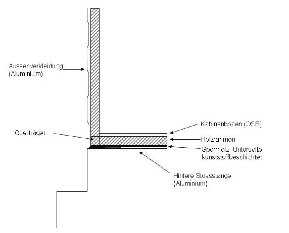 Die aufgesägte Unterkante wird in jetzt von einer Aluminiumleiste verdeckt und abgedichtet. Ab Werk ist die Aussenhaut hier unter den Kabinenboden abgekantet und mit der Stossstange festgeklemmt.