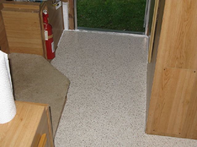 Der neue Belag ist ein handelsüblicher PVC-Boden vom Baumarkt. Er wird mit passendem Kleber verklebt. Die ursprünglichen Kederleisten werden später durch schmale Zierleisten aus Holz ersetzt.
